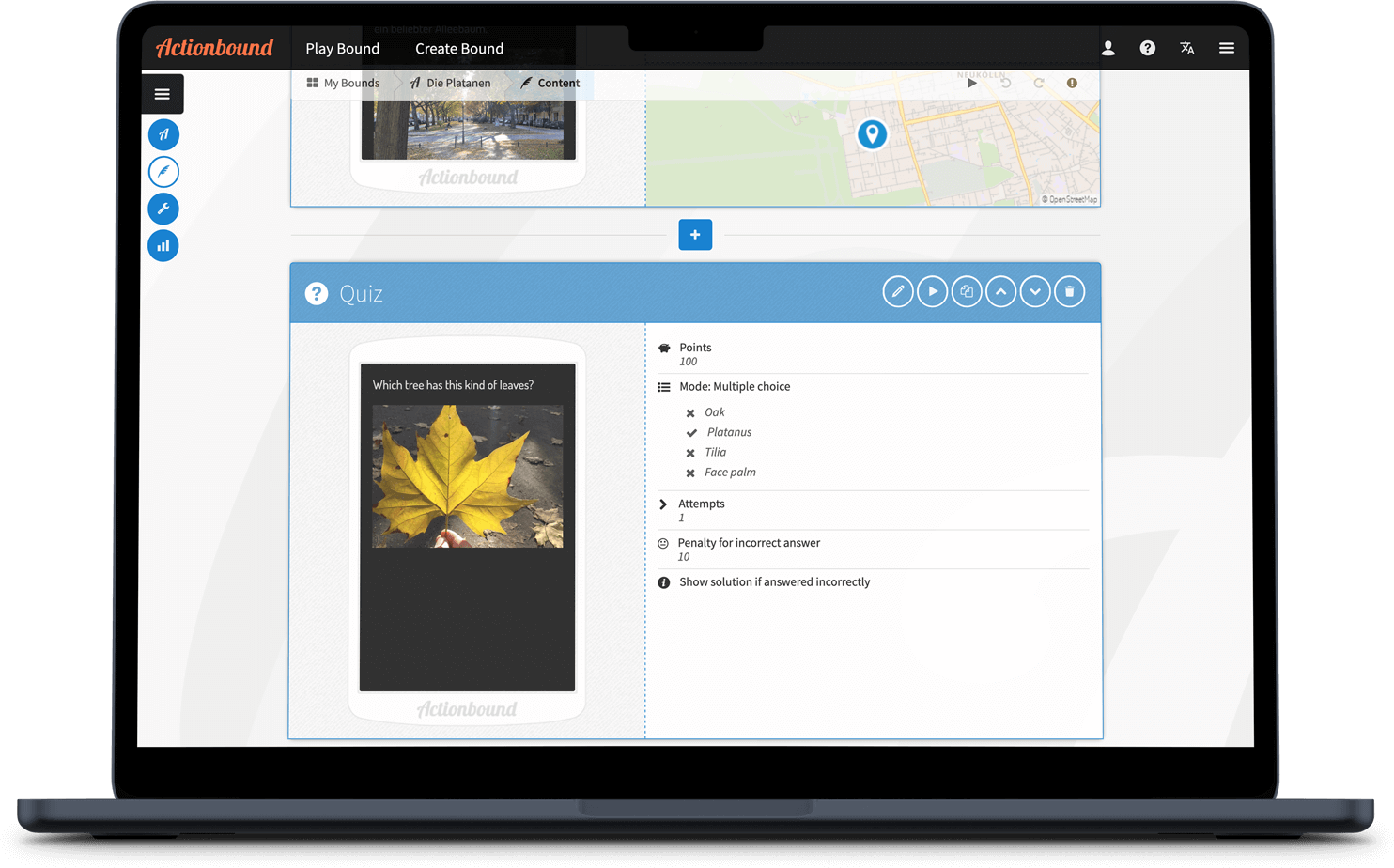 Take full advantage of the huge potential of gamification with the Bound Creator's extensive game elements and tools like GPS locations, directions, maps, compass, pictures, videos, quizzes, missions, tournaments, QR codes and much more to create fun and exciting mobile app-based adventures.